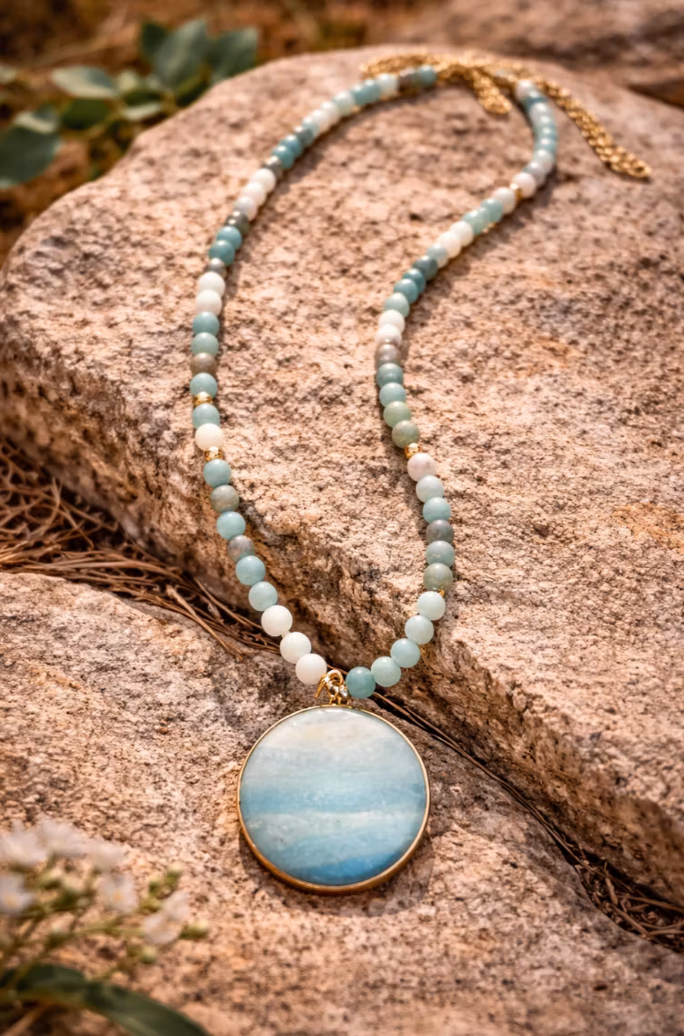 Ett harmoniskt halsband med pärlor i mjuka nyanser av blått, sand och kräm, vackert kombinerade med en rund mittsten som för tankarna till hav och himmel. Den guldfärgade infattningen ger en elegant kontrast till de naturliga stenarna och skapar ett tidlöst, bohemiskt uttryck.
