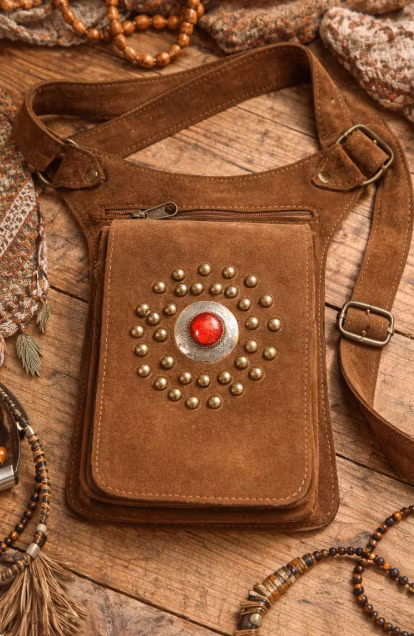 En handgjord väska i mjuk mocka, skapad av skickliga hantverkare i Marocko. En tidlös boho-väska som kombinerar funktion, hantverk och stil – perfekt för både vardag och resa.