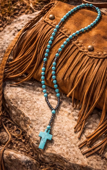 Ett uttrycksfullt rosary-inspirerat halsband med turkosa pärlor i kombination med mörka metalliska detaljer. Halsbandet avslutas med ett kors i turkos sten som ger smycket en stark men samtidigt harmonisk karaktär.